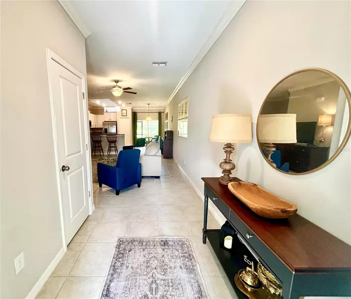 Ceiling Fans(s), Crown Molding, Eat-in Kitchen, High Ceilings, Kitchen/Family Room Combo, Living Room/Dining Room Combo, Open Floorplan, PrimaryBedroom Upstairs, Solid Surface Counters, Stone Counters, Thermostat, Walk-In Closet(s)